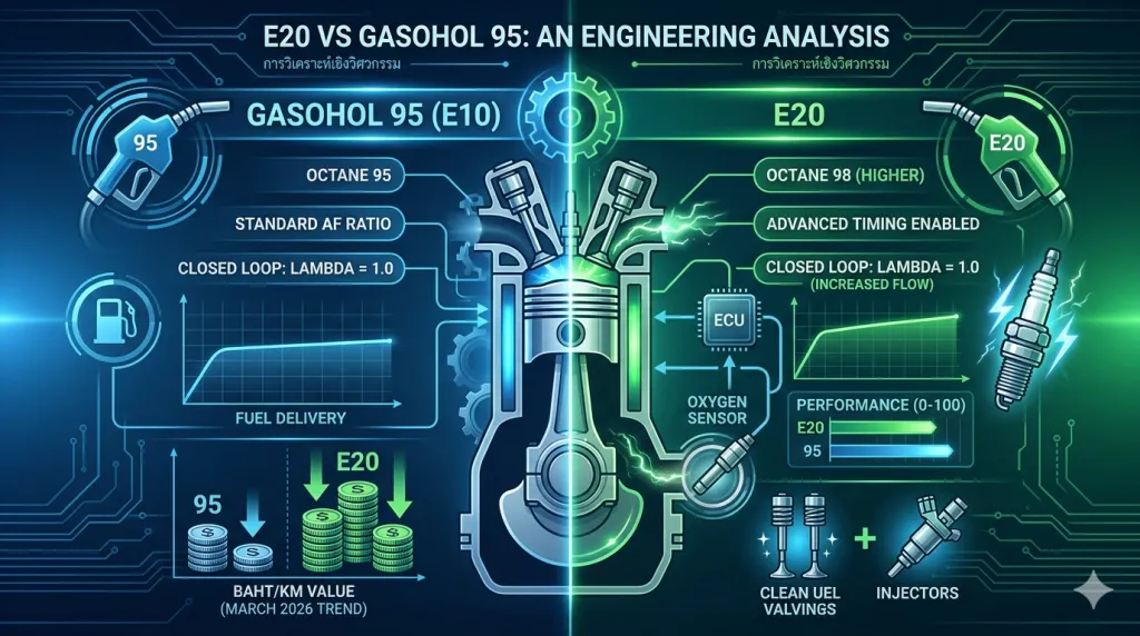 - ผลลัพธ์: แม้ E20 จะมีพลังงานต่อหน่วยน้อยกว่า แต่เมื่อระบบฉีดมันเข้าไปเยอะขึ้นเพื่อรักษาสมดุลอากาศ พลังงานรวมที่เกิดขึ้นในห้องเผาไหม้ของ E20 จึง สูงกว่า Gasohol 95 ประมาณ 2.3%